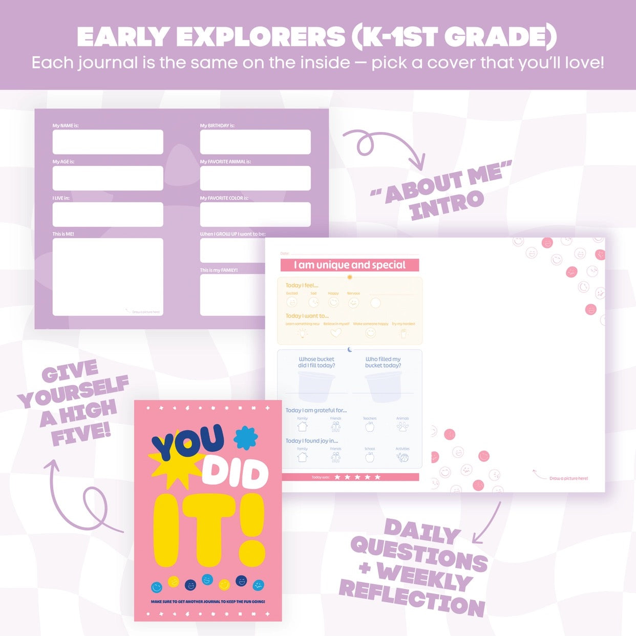 This age group journal (age 4-7) provides more of a fill-in-the blank format with visual cues in comparison to the 2nd - 6th grade version.