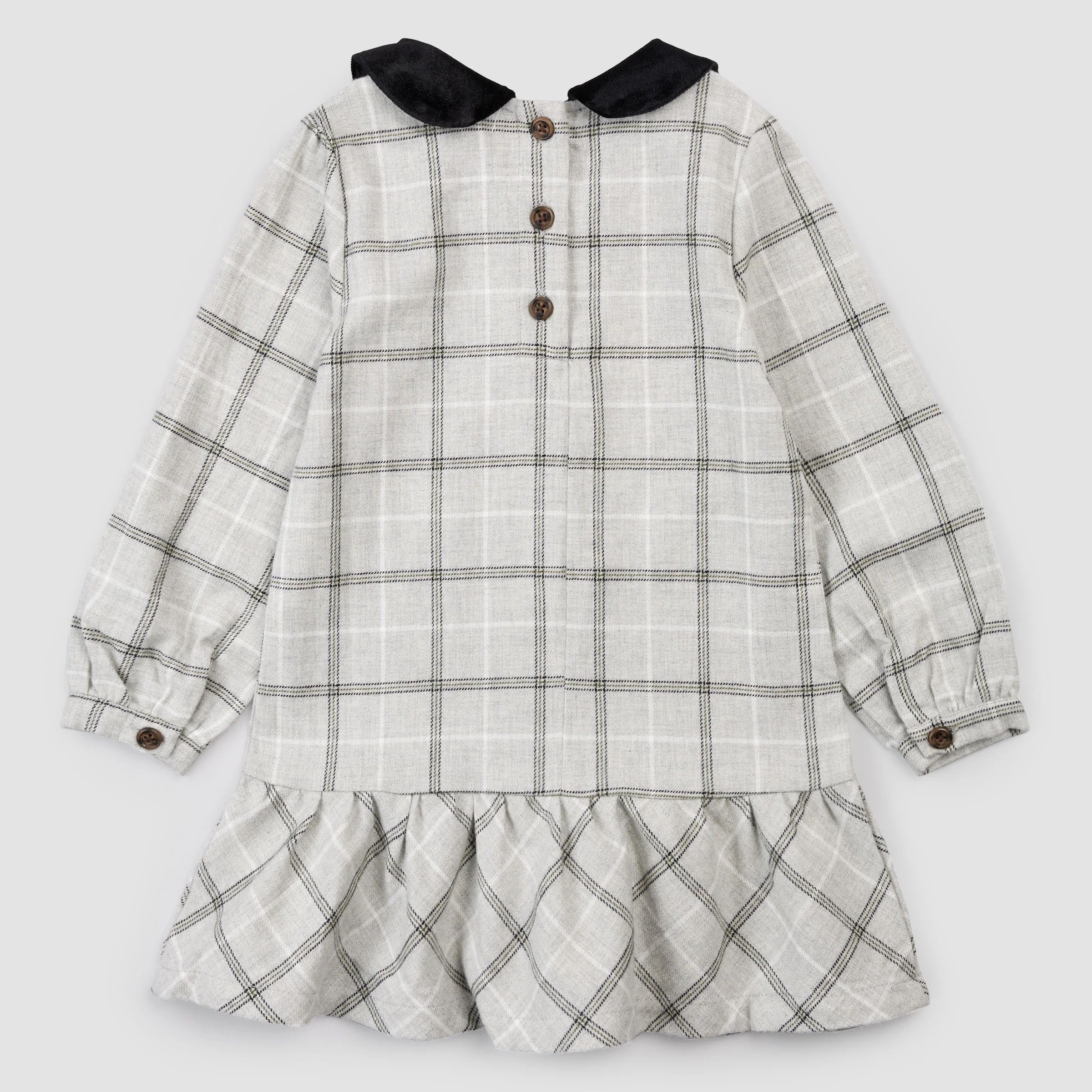 This soft flannel dress will be a seasonal favorite, featuring a tiered skirt and a vintage-inspired velvet Peter Pan collar. Perfect for Fall, the brushed yarn dyed flannel is cozy and gentle on her skin and the button placket at the back makes dressing quick and fuss-free on chilly mornings. Pair with tights to beat the chill when heading out for a family meal or an all-day adventure.